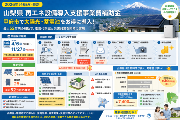 2026年(令和8年)、山梨県・甲府市で太陽光発電・蓄電池を導入するなら、 「再エネ設備導入支援事業費補助金」の活用が必須です。