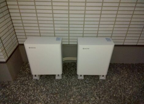 屋外設置型の蓄電池で、建物外観を損なわないシンプルなデザインが特長です。専用の基礎上に設置し、転倒防止や耐久性にも配慮しています。